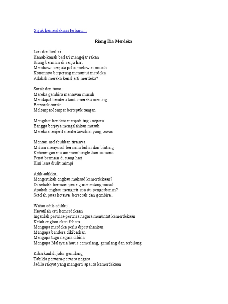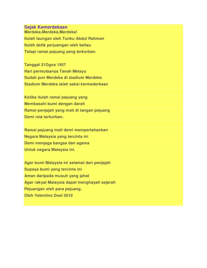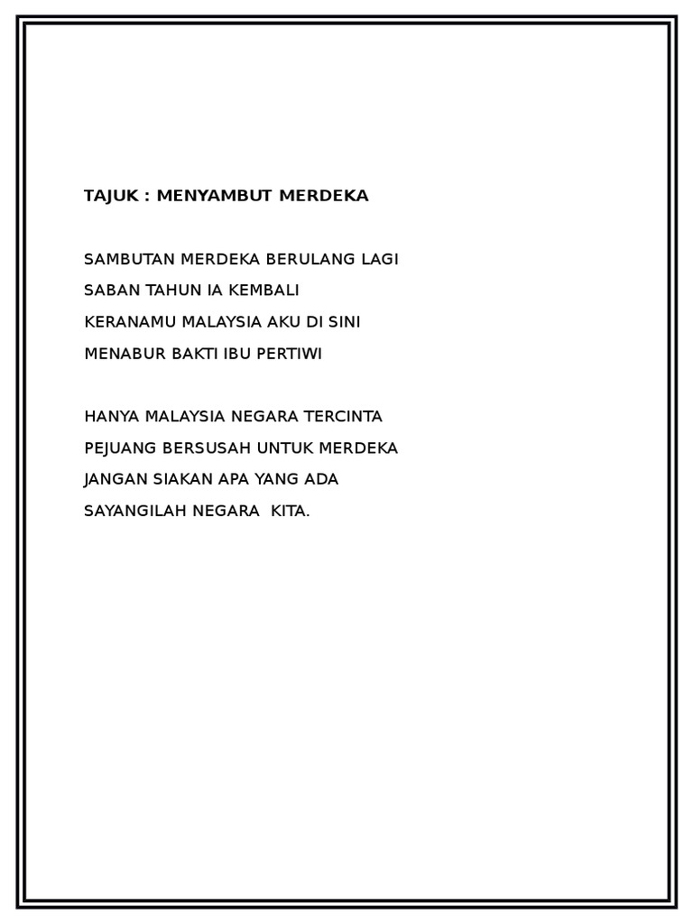 Sajak kemerdekaan malaysia dalam bahasa inggris. Buminya subur dengan tanaman Tanaman tumbuh di atas banjaran Tumbuh sampai ke dalam laman Hutan dan dusun bagaikan taman. Download View Sajak Sajak Kemerdekaan as PDF for free.