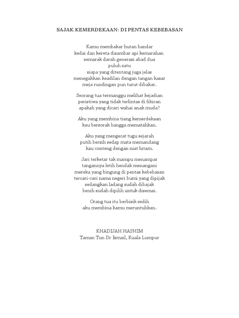 Fokusmuriacoid Gaya Hidup Puisi Hari Kemerdaan yaitu Segala. Anda boleh membaca lebih banyak puisi. Sajak Kemerdekaan - Keranamu Malaysia Keranamu Malaysia Tegakkan nusa gagahkan bangsa Kita susun seribu langkah menuju ke hadapan Bersama mensesah pekat malam menerjah gelombang Berlari mengejar cahaya menepati janji di hujung jalan Walau berdepan sejuta rintangan Sekali pun jatuh di medan perjuangan Namun tetap meredah.